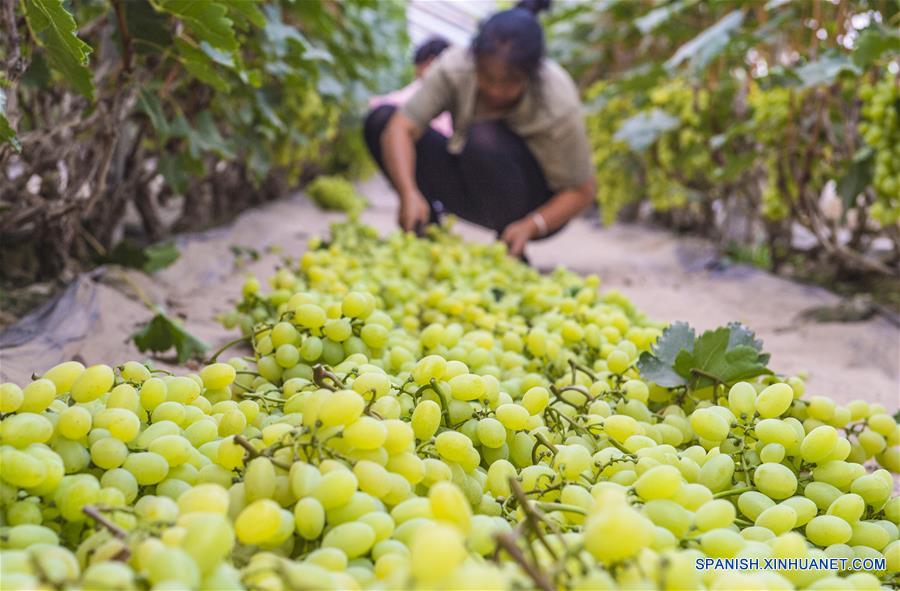 Hebei, 26/06/2019 (El Pueblo en Línea) - Una residente selecciona uvas, en la villa de Chucun de la localidad de Tanglin en el distrito de Zaoqiang, provincia de Hebei, en el norte de China, el 25 de junio de 2019. Más de 2.000 mu (aproximadamente 133,3 hectáreas) plantaciones de uvas de invernadero promovidas por las autoridades locales han aumentado los ingresos de más de 1.000 residentes en los últimos a?os. (Xinhua/Li Xiaoguo)