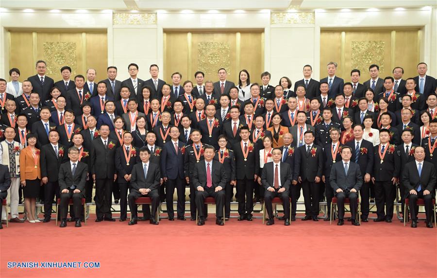 El presidente chino, Xi Jinping, también secretario general del Comité Central del Partido Comunista de China (PCCh) y presidente de la Comisión Militar Central, posa para una fotografía grupal con representantes de funcionarios modelo que se encuentran en Beijing para asistir a una ceremonia de premiación nacional en Beijing, capital de China, el 25 de junio de 2019. El primer ministro Li Keqiang y Wang Huning, miembro del Secretariado del Comité Central del PCCh, quienes ambos son miembros del Comité Permanente del Buró Político del Comité Central del PCCh, estuvieron presentes. (Xinhua/Li Xueren)