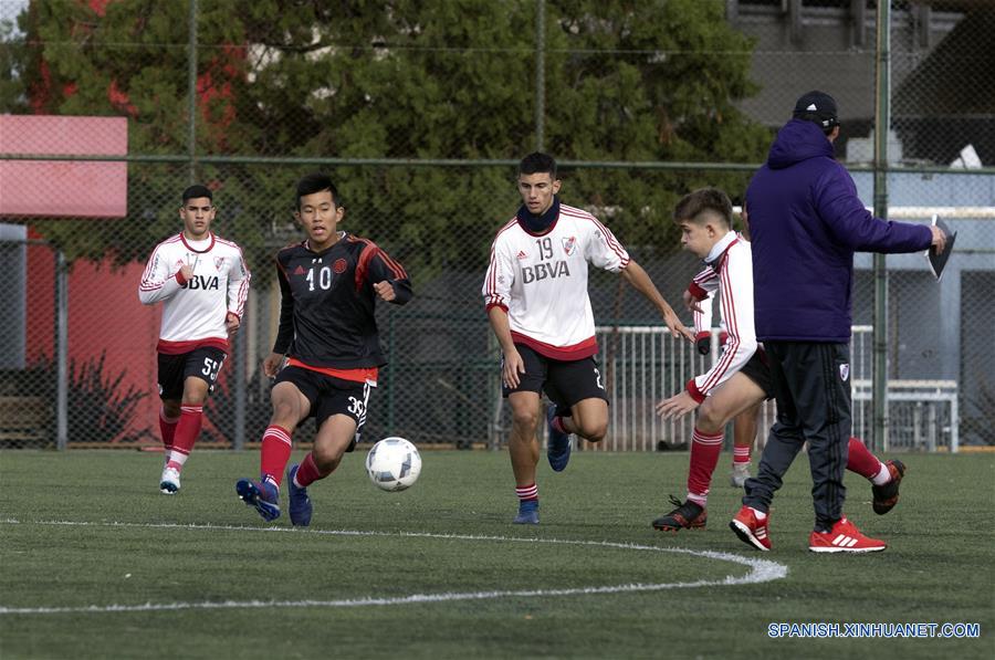 BUENOS AIRES, 26 junio, 2019 (Xinhua) -- Imagen del 21 de junio de 2019 de Lyu Sunhao (c), disputando el balón con sus compa?eros durante un entrenamiento en las canchas auxiliares del Club Atlético River Plate, en la ciudad de Buenos Aires, Argentina. Lyu Sunhao tiene 15 a?os y lleva un mes viviendo en Buenos Aires, en la pensión del Club Atlético River Plate, y su meta es clara, "mi sue?o es jugar en Argentina, ser el primer chino en debutar en la primera división de Sudamérica y después volver a mi país y jugar para la selección". (Xinhua/Martín Zabala)