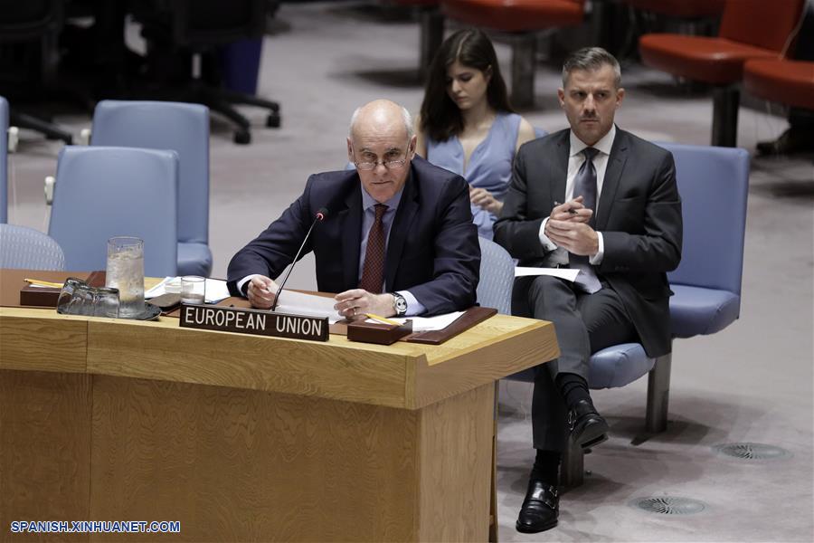 NUEVA YORK, 26 junio, 2019 (Xinhua) -- Joao Vale de Almeida, jefe de la delegación de la Unión Europea (UE) ante la Organización de las Naciones Unidas (ONU), participa durante la sesión informativa semestral del Consejo de Seguridad sobre el cumplimiento de la resolución 2231, que respaldó el Plan de Acción Integral Conjunto (PAIC) sobre el programa nuclear de Irán, en la sede de la Organización de las Naciones Unidas (ONU), en Nueva York, Estados Unidos, el 26 de junio de 2019. Joao Vale de Almeida, jefe de la delegación de la Unión Europea (UE) ante la ONU, reiteró el miércoles el apoyo al PAIC, conocido comúnmente como acuerdo nuclear de Irán, a pesar de las crecientes tensiones entre Estados Unidos y la república islámica. (Xinhua/Li Muzi)