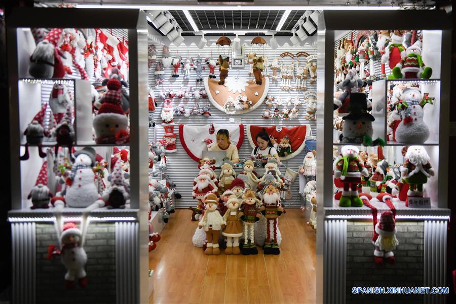 Yiwu, Zhejiang, 27/06/2019 (El Pueblo en Línea) - Artículos de Navidad son exhibidos para su venta en un puesto de la Ciudad de Comercio Internacional de Yiwu, en Yiwu, provincia de Zhejiang, en el este de China, el 26 de junio de 2019. Con más de 400 plantas que fabrican productos navide?os, Yiwu ha llegado a su temporada alta de producción y venta de productos navide?os recientemente. Las exportaciones de Yiwu de productos de Navidad aumentó del 18,12 por ciento interanual a alrededor de 2,27 mil millones de yuanes (aproximadamente 330 millones de dólares) en 2018. (Xinhua/Huang Zongzhi)