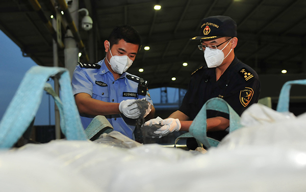 Los funcionarios de aduanas de Qingdao, en la provincia de Shandong, revisan desechos de contrabando, septiembre 2019. (Foto: Zhang Jingang/ China Daily)