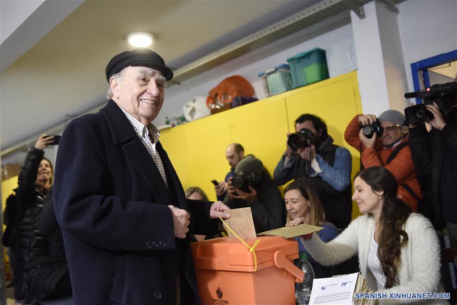 El expresidente uruguayo y precandidato por el opositor Partido Colorado, Julio María Sanguinetti (i-frente), emite su voto durante las elecciones primarias en Montevideo, capital de Uruguay, el 30 de junio de 2019. Las elecciones primarias en Uruguay, en las que los partidos políticos eligen a sus candidatos a la presidencia para los comicios generales del 27 de octubre, transcurren el domingo con normalidad y con llamados a la población a que asista a las urnas. (Xinhua/Nicolás Celaya)