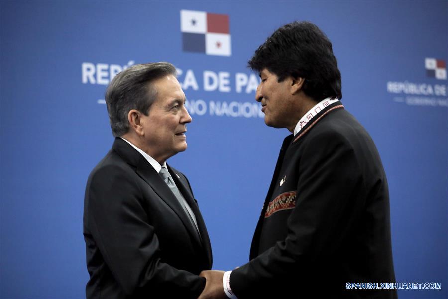 Laurentino Cortizo (i), recibe al presidente boliviano, Evo Morales (d), durante su ceremonia de juramentación como presidente de Panamá, en el auditorio del Centro de Convenciones Atlapa, en la Ciudad de Panamá, capital de Panamá, el 1 de julio de 2019. Laurentino Cortizo de 66 a?os y del Partido Revolucionario Democrático (PRD), instó el lunes durante su toma de posesión como presidente de Panamá para los próximos cinco a?os a superar la desigualdad y unir fuerzas en el país. (Xinhua/Mauricio Valenzuela)