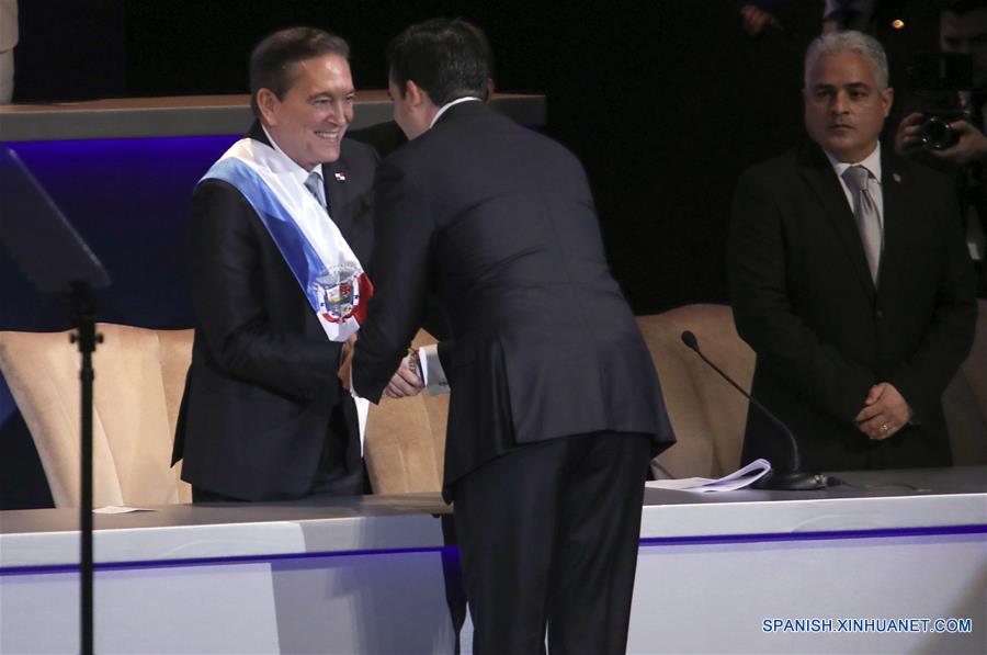 El presidente paname?o, Laurentino Cortizo (i), saluda a su vicepresidente, Gabriel Carrizo (2-d), su ceremonia de juramentación, en el auditorio del Centro de Convenciones Atlapa, en la Ciudad de Panamá, capital de Panamá, el 1 de julio de 2019. Laurentino Cortizo de 66 a?os y del Partido Revolucionario Democrático (PRD), instó el lunes durante su toma de posesión como presidente de Panamá para los próximos cinco a?os a superar la desigualdad y unir fuerzas en el país. (Xinhua/Mauricio Valenzuela)
