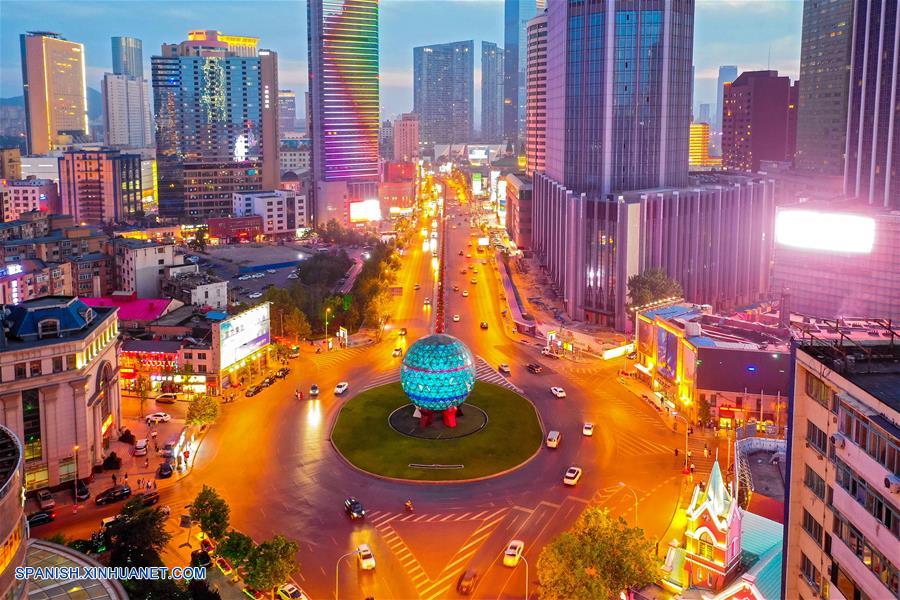 DALIAN, 1 julio, 2019 (Xinhua) -- Imagen aérea del 19 de junio de 2019 de la Plaza Youhao en Dalian, provincia de Liaoning, en el noreste de China. El Foro Davos de Verano 2019 se llevará a cabo del 1 al 3 de julio en la ciudad costera de Dalian, en el noreste de China, con enfoque en la globalización. También conocido como la XIII Conferencia Anual de Nuevos Campeones 2019, el foro de este a?o tendrá el tema de "Liderazgo 4.0: Triunfando en una nueva era de globalización". (Xinhua/Piao Feng)