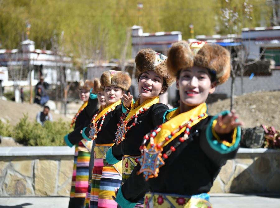 Los bailarines practican para actuar en Lhasa, región autónoma del Tíbet, el 20 de abril de 2019. La ayuda turística genera ingresos para los aldeanos locales. [Foto / Xinhua]