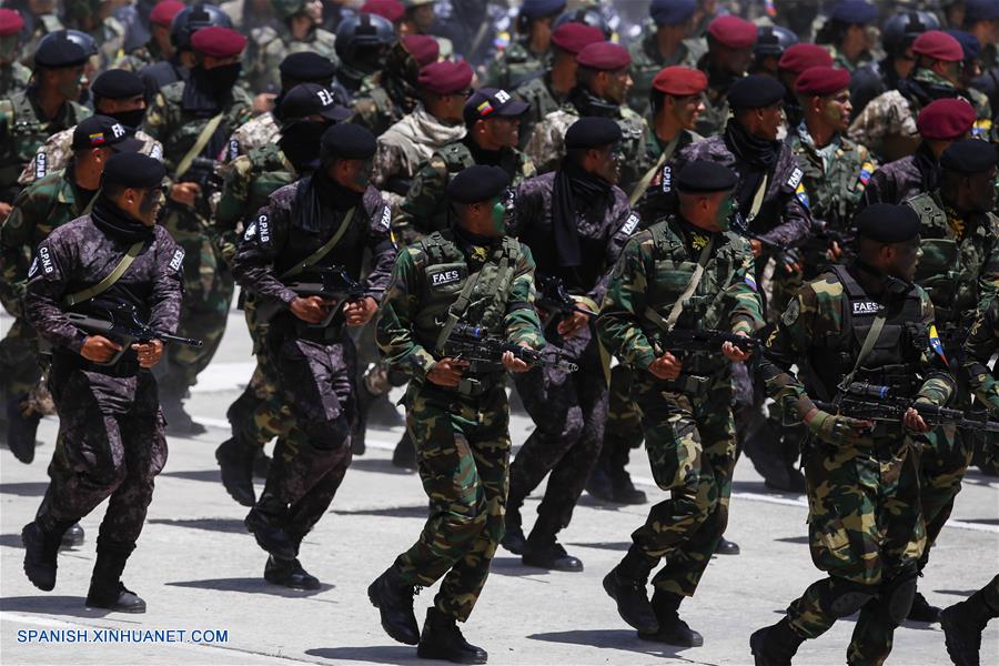 Elementos del ejército asisten a un desfile para conmemorar el 208 aniversario de la Independencia de Venezuela, en Caracas, Venezuela, el 5 de julio de 2019. El presidente venezolano, Nicolás Maduro, anunció el viernes en un discurso con motivo del desfile cívico-militar de celebración de los 208 a?os de la Independencia venezolana, que la Fuerza Armada Nacional Bolivariana (FANB) realizará ejercicios militares el 24 de julio en homenaje al Libertador Simón Bolívar, nacido el 24 de julio de 1783, y a la Armada, creada en 1811. (Xinhua/Str)