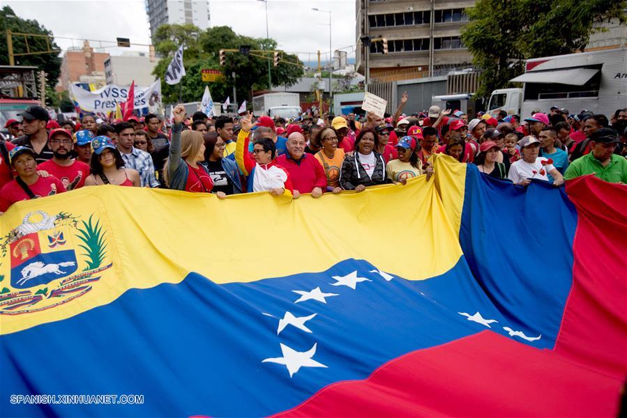 Personas sostienen una bandera nacional de Venezuela, en un desfile en conmemoración del 208 aniversario de la independencia de Venezuela, en Caracas, Venezuela, el 5 de julio de 2019. El presidente venezolano, Nicolás Maduro, anunció el viernes en un discurso con motivo del desfile cívico-militar de celebración de los 208 a?os de la independencia venezolana, que la Fuerza Armada Nacional Bolivariana (FANB) realizará ejercicios militares el 24 de julio en homenaje al Libertador Simón Bolívar, nacido el 24 de julio de 1783, y a la Armada, creada en 1811. (Xinhua/Marcos Salgado)
