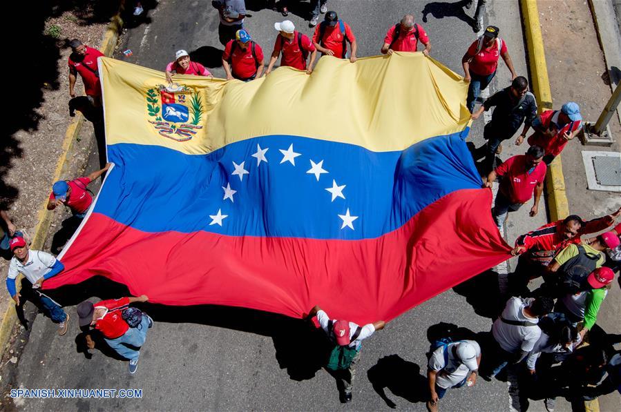 Personas sostienen una bandera nacional venezolana en una marcha para conmemorar el 208 aniversario de la Independencia de Venezuela, en Caracas, Venezuela, el 5 de julio de 2019. El presidente venezolano, Nicolás Maduro, anunció el viernes en un discurso con motivo del desfile cívico-militar de celebración de los 208 a?os de la Independencia venezolana, que la Fuerza Armada Nacional Bolivariana (FANB) realizará ejercicios militares el 24 de julio en homenaje al Libertador Simón Bolívar, nacido el 24 de julio de 1783, y a la Armada, creada en 1811. (Xinhua/Marcos Salgado)