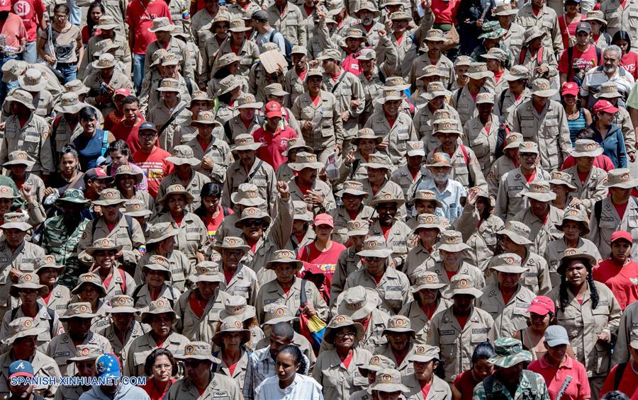 Elementos de la Fuerza Armada Nacional Bolivariana (FANB) asisten a una marcha para conmemorar el 208 aniversario de la Independencia de Venezuela, en Caracas, Venezuela, el 5 de julio de 2019. El presidente venezolano, Nicolás Maduro, anunció el viernes en un discurso con motivo del desfile cívico-militar de celebración de los 208 a?os de la Independencia venezolana, que la Fuerza Armada Nacional Bolivariana (FANB) realizará ejercicios militares el 24 de julio en homenaje al Libertador Simón Bolívar, nacido el 24 de julio de 1783, y a la Armada, creada en 1811. (Xinhua/Marcos Salgado)