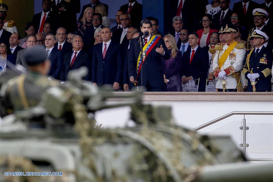 El presidente de Venezuela, Nicolás Maduro (c), habla en un desfile para conmemorar el 208 aniversario de la Independencia de Venezuela, en Caracas, Venezuela, el 5 de julio de 2019. El presidente venezolano, Nicolás Maduro, anunció el viernes en un discurso con motivo del desfile cívico-militar de celebración de los 208 a?os de la Independencia venezolana, que la Fuerza Armada Nacional Bolivariana (FANB) realizará ejercicios militares el 24 de julio en homenaje al Libertador Simón Bolívar, nacido el 24 de julio de 1783, y a la Armada, creada en 1811. (Xinhua/Str)