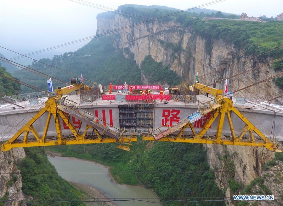 Trabajadores en la obra del arco principal de un puente estratégico para China, 7 de julio del 2019. Situado en la zona fronteriza de las provincias de Sichuan, Guizhou y Yunnan, este domingo se terminó de montar su arco principal que sienta las bases para su terminación, prevista para finales del 2019. Una vez construido, el puente resolverá dificultades de tráfico para cientos de miles de personas que viven en la zona fronteriza de las tres provincias y hará su contribución a la mitigación de la pobreza en la zona de la monta?a Wumeng. (Foto: Xinhua/Liu Kun)