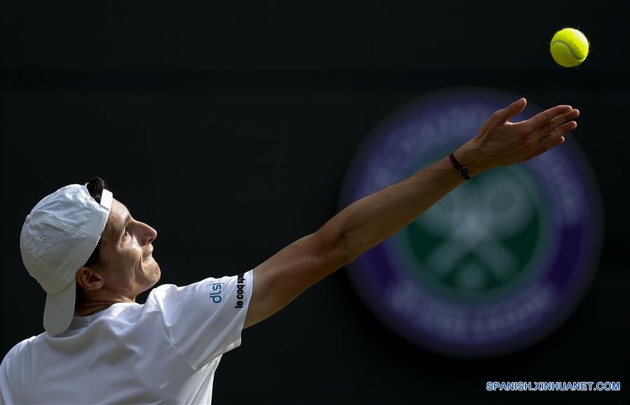 LONDRES, 8 julio, 2019 (Xinhua) -- Ugo Humbert, de Francia, sirve la pelota durante el partido individual varonil de la cuarta ronda del Campeonato de Wimbledon 2019, ante Novak Djokovic, de Serbia, en Londres, Reino Unido, el 8 de julio de 2019. (Xinhua/Han Yan)