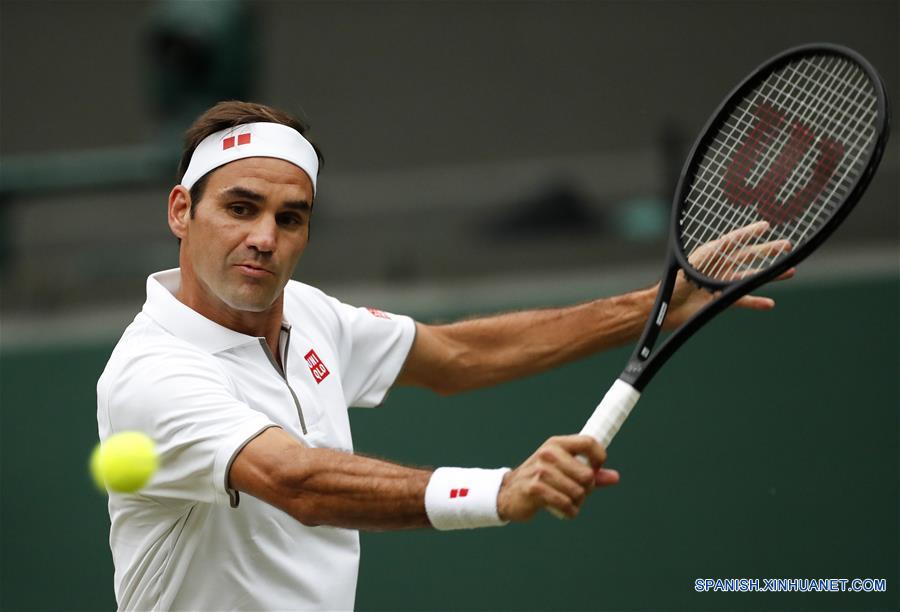LONDRES, 8 julio, 2019 (Xinhua) -- Roger Federer, de Suiza, devuelve la pelota a Matteo Berrettini, de Italia, durante el partido individual varonil de la cuarta ronda del Campeonato de Wimbledon 2019, en Londres, Reino Unido, el 8 de julio de 2019. (Xinhua/Han Yan) (vf) (ce)