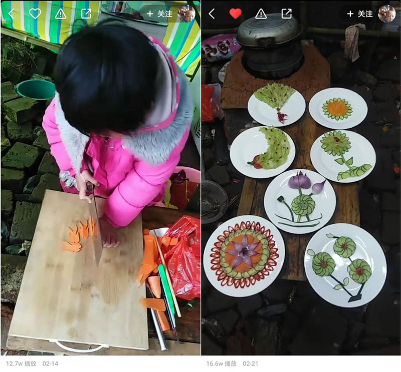 Izquierda: Liu Limei, de 6 a?os, corta zanahoria en forma de golondrina. Derecha: Los trabajos de tallado de alimentos realizados por Liu. [Foto / Kuaishou]