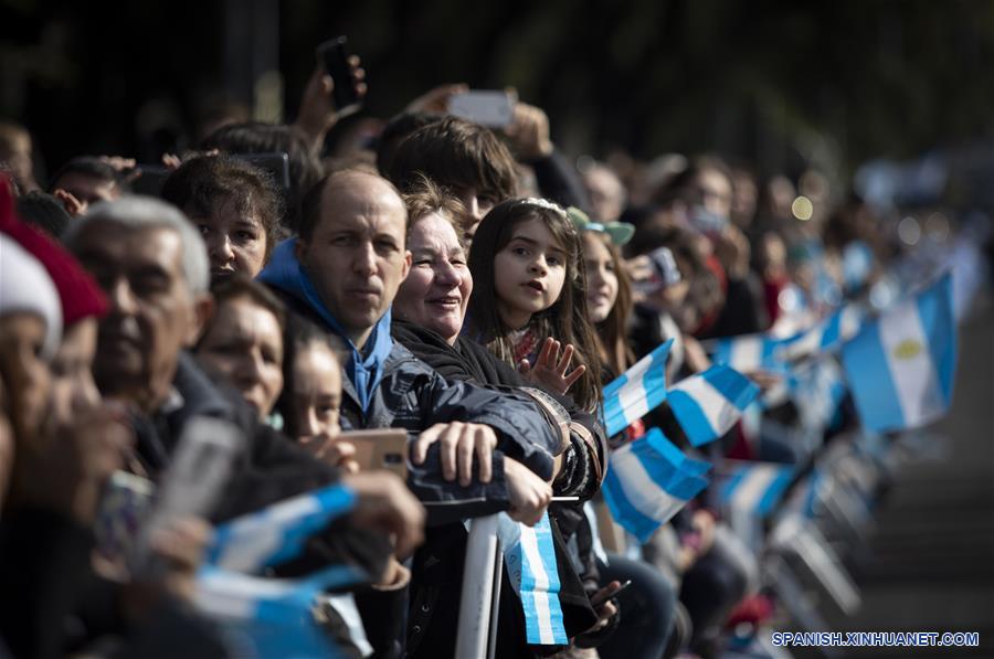Residentes asisten al desfile militar en el marco de la conmemoración del Día de la Independencia, en la ciudad de Buenos Aires, capital de Argentina, el 9 de julio de 2019. El presidente de Argentina, Mauricio Macri, encabezó el martes en la ciudad norte?a de Tucumán el acto central por el Día de la Independencia, y luego asistió en Buenos Aires a un desfile militar con la presencia de cerca de 4.000 efectivos. (Xinhua/Martín Zabala)