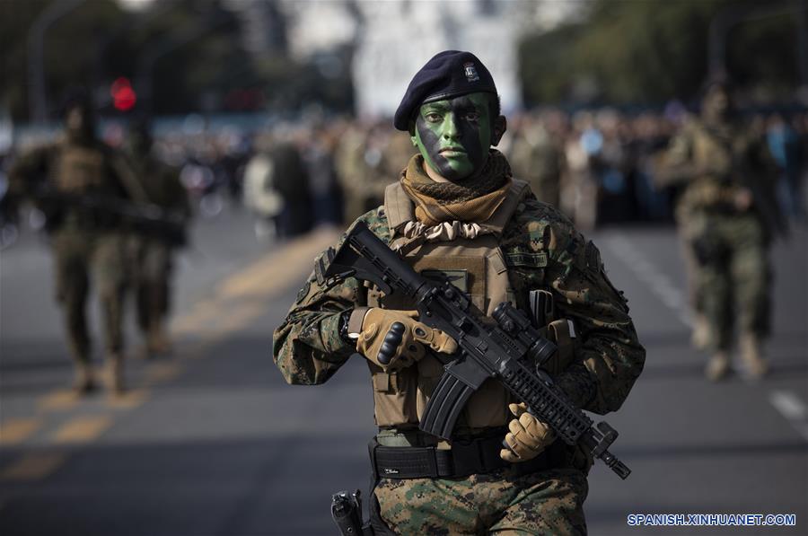 Un elemento de las Fuerzas Armadas de Argentina participa en el desfile militar en el marco de la conmemoración del Día de la Independencia, en la ciudad de Buenos Aires, capital de Argentina, el 9 de julio de 2019. El presidente de Argentina, Mauricio Macri, encabezó el martes en la ciudad norte?a de Tucumán el acto central por el Día de la Independencia, y luego asistió en Buenos Aires a un desfile militar con la presencia de cerca de 4.000 efectivos. (Xinhua/Martín Zabala)