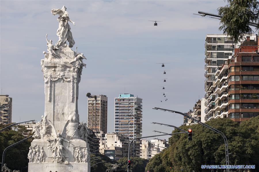 Helicópteros pertenecientes a las Fuerzas Armadas de Argentina participan en el desfile militar en el marco de la conmemoración del Día de la Independencia, en la ciudad de Buenos Aires, capital de Argentina, el 9 de julio de 2019. El presidente de Argentina, Mauricio Macri, encabezó el martes en la ciudad norte?a de Tucumán el acto central por el Día de la Independencia, y luego asistió en Buenos Aires a un desfile militar con la presencia de cerca de 4.000 efectivos. (Xinhua/Martín Zabala)