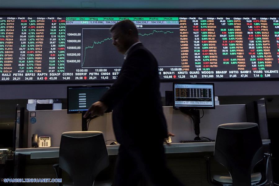 Un hombre camina frente a un cartel electrónico que muestra el comportamiento de la Bolsa de Valores de Sao Paulo, en el marco de la votación de la reforma de pensiones, en Sao Paulo, Brasil, el 10 de julio de 2019. El presidente de la Cámara de Diputados de Brasil, Rodrigo Maia, consideró que habrá un margen "importante" de votos para aprobar la reforma de pensiones, al iniciar el miércoles la sesión plenaria para votar la propuesta. (Xinhua/Rahel Patrasso)