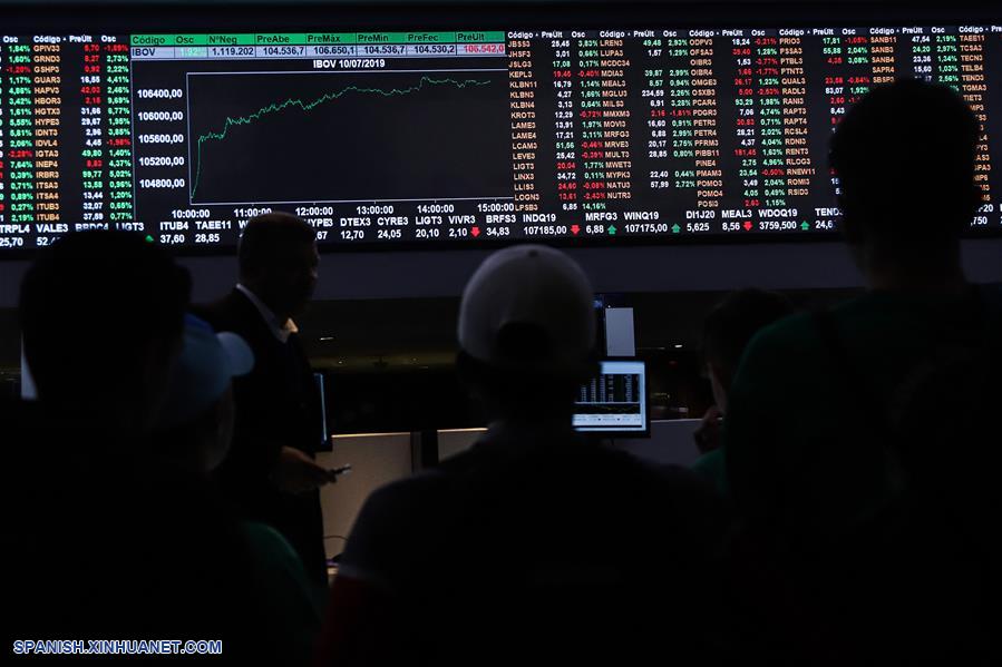 Personas permanecen frente a un cartel electrónico que muestra el comportamiento de la Bolsa de Valores de Sao Paulo, en el marco de la votación de la reforma de pensiones, en Sao Paulo, Brasil, el 10 de julio de 2019. El presidente de la Cámara de Diputados de Brasil, Rodrigo Maia, consideró que habrá un margen "importante" de votos para aprobar la reforma de pensiones, al iniciar el miércoles la sesión plenaria para votar la propuesta. (Xinhua/Rahel Patrasso)