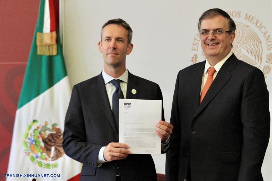 El secretario de Relaciones Exteriores mexicano, Marcelo Ebrard (d), y el director de Operaciones de la Corporación para la Inversión Privada en el Extranjero (OPIC, por sus siglas en inglés) de Estados Unidos, Ryan Brennan (i), posan luego de la firma de la Carta de Intención con la OPIC, en la Ciudad de México, capital de México, el 10 de julio de 2019. Estados Unidos explorará financiar proyectos de desarrollo en el sur de México por unos 720 millones de dólares a través de su OPIC, informó el miércoles la cancillería mexicana. (Xinhua/Str)