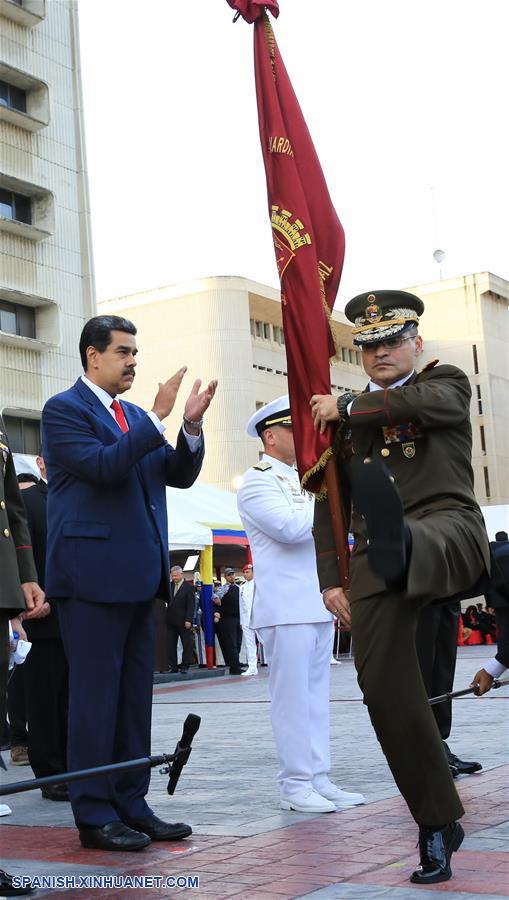 Imagen cedida por la Presidencia de Venezuela, del presidente venezolano, Nicolás Maduro (i), encabezando un acto de transmisión de mando militar, en el Fuerte Tiuna, en Caracas, Venezuela, el 10 de julio de 2019. Maduro encabezó el miércoles el acto de transmisión de mando de los Comandantes Generales del Ejército Bolivariano, de la Guardia Nacional Bolivariana y de la Milicia Bolivariana, cuyos jefes fueron renovados en días pasados. (Xinhua/Presidencia de Venezuela)