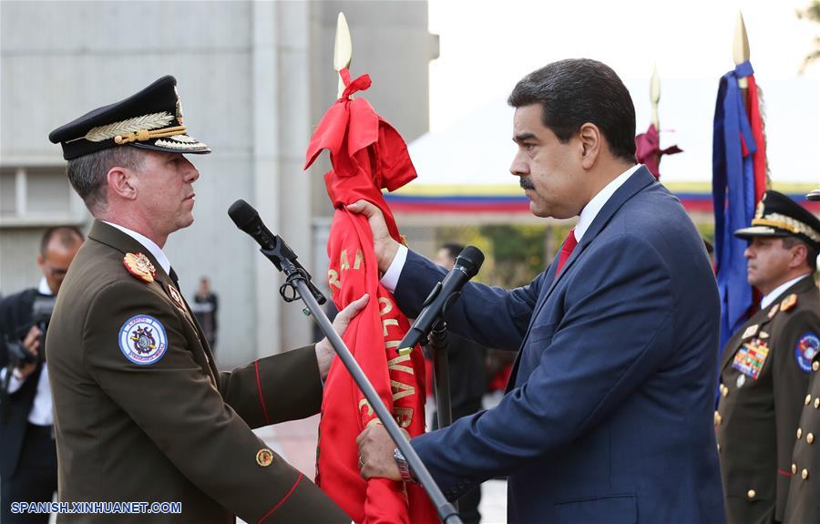 Imagen cedida por la Presidencia de Venezuela, del presidente venezolano, Nicolás Maduro (d), encabezando un acto de transmisión de mando militar, en el Fuerte Tiuna, en Caracas, Venezuela, el 10 de julio de 2019. Maduro encabezó el miércoles el acto de transmisión de mando de los Comandantes Generales del Ejército Bolivariano, de la Guardia Nacional Bolivariana y de la Milicia Bolivariana, cuyos jefes fueron renovados en días pasados. (Xinhua/Presidencia de Venezuela)