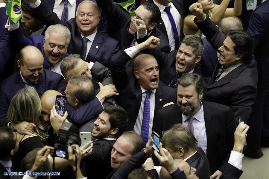 Representantes del gobierno celebran durante la sesión para votar sobre la propuesta de reforma de pensiones, en la Cámara de Diputados, en Brasilia, Brasil, el 10 de julio de 2019. El plenario de la Cámara de Diputados de Brasil aprobó el miércoles, en primera vuelta, el texto básico de la Propuesta de Enmienda Constitucional (PEC 6/2019) que altera el sistema de pensiones, presentada por el gobierno de Jair Bolsonaro. (Xinhua/Lucio Tavora)