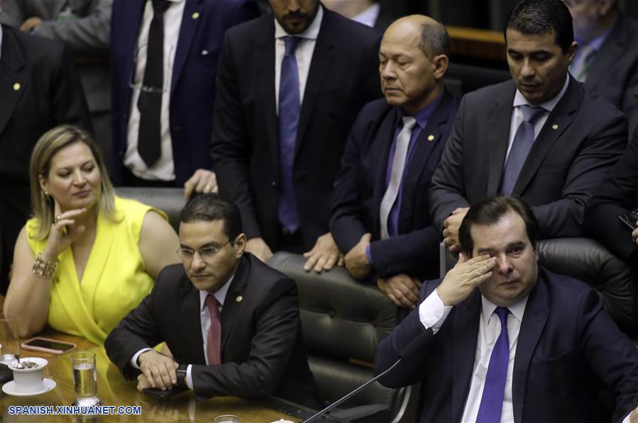 El presidente de la Cámara de Diputados, Rodrigo Maia (d-abajo), reacciona durante la sesión para votar sobre la propuesta de reforma de pensiones, en la Cámara de Diputados, en Brasilia, Brasil, el 10 de julio de 2019. El plenario de la Cámara de Diputados de Brasil aprobó el miércoles, en primera vuelta, el texto básico de la Propuesta de Enmienda Constitucional (PEC 6/2019) que altera el sistema de pensiones, presentada por el gobierno de Jair Bolsonaro. (Xinhua/Lucio Tavora)