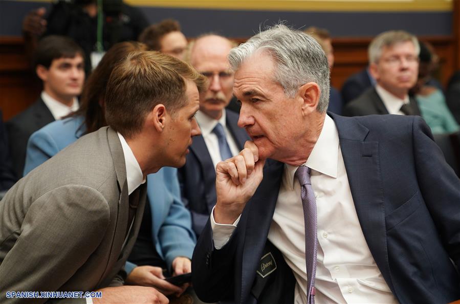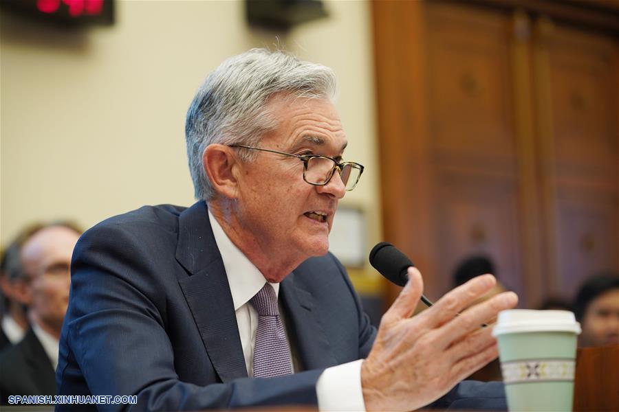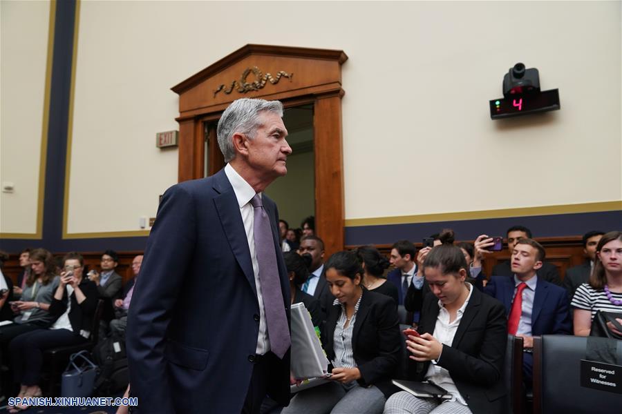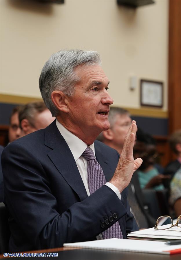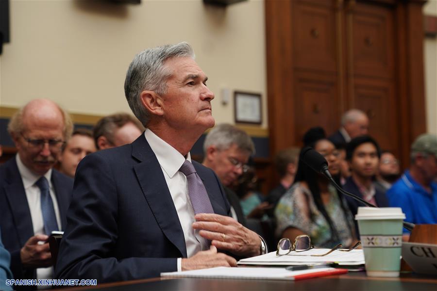 El presidente de la Reserva Federal estadounidense, Jerome Powell, declara ante el Comité de Servicios Financieros de la Cámara sobre el estado de la economía estadounidense, en el Capitolio en Washington D.C., Estados Unidos, el 10 de julio de 2019. Jerome Powell, dijo el miércoles que las contracorrientes, tales como las tensiones comerciales y las preocupaciones sobre el crecimiento global, han estado pesando en la actividad y perspectiva económicas de Estados Unidos. (Xinhua/Liu Jie)