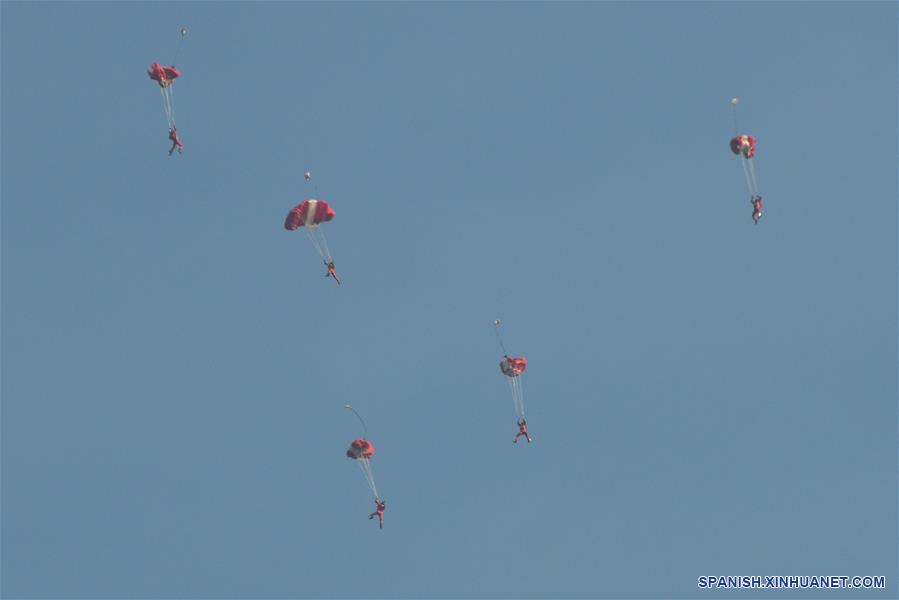 Paracaidistas del comando Leones Rojos de las Fuerzas Armadas de Singapur participan durante el ensayo del Desfile del Día Nacional llevado a cabo en la ciudad de Singapur, capital de Singapur, el 13 de julio de 2019. Singapur celebra su independencia el 9 de agosto. (Xinhua/Then Chih Wey)