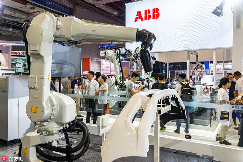 Un brazo robótico en exhibición en el stand de ABB durante la XX Feria Internacional de la Industria de China en Shanghai, el 20 de septiembre de 2018. [Foto / IC]
