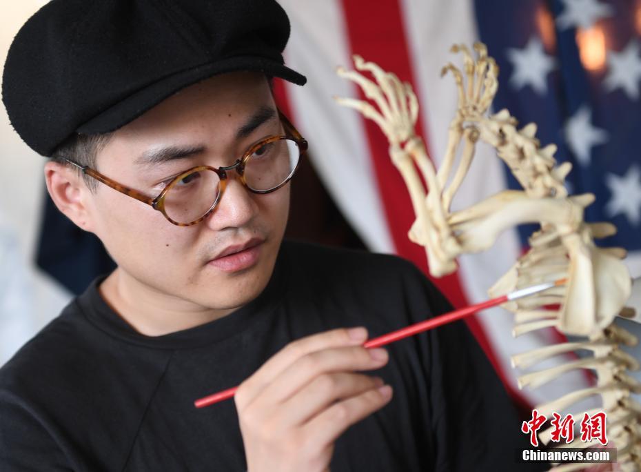 Beijing, 17/07/2019 (El Pueblo en Línea) - El 15 de julio, Li Zhangda arregla un esqueleto de animal creado por él. Li elabora especímenes de mascotas en Hangzhou, provincia de Zhejiang. En los últimos a?os, Li ha prolongado de esta manera el cari?o y el acompa?amiento que diez mascotas ofrecían a sus due?os creando especímenes. (Foto: Wang Gang)