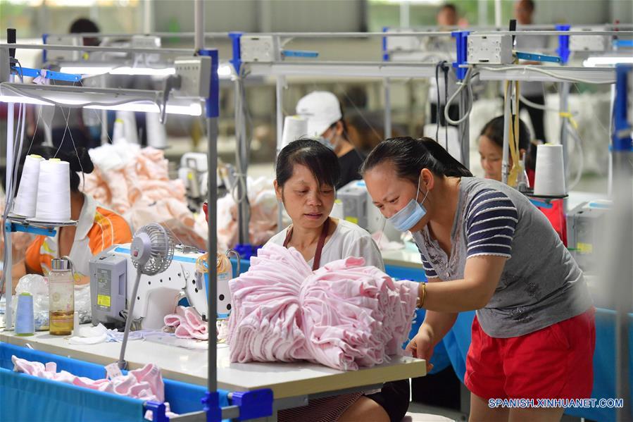 GUANGXI, 16 julio, 2019 (Xinhua) -- Imagen del 15 de julio de 2019 de trabajadoras comunicándose en una fábrica, en el distrito de Rong'an, en la región autónoma de la etnia zhuang de Guangxi, en el sur de China. Con el apoyo de un programa provincial de alivio de la pobreza, el distrito de Rong'an ha traído empresas para establecer peque?as o micro fábricas y crear empleos para las comunidades afectadas por la pobreza. (Xinhua/Huang Xiaobang)