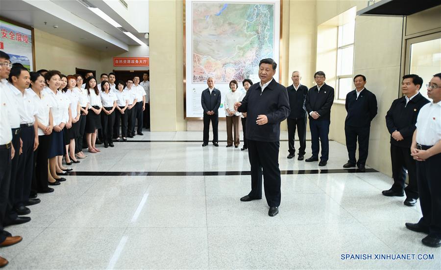 El presidente chino, Xi Jinping, también secretario general del Comité Central del Partido Comunista de China (PCCh) y presidente de la Comisión Militar Central, inspecciona la oficina de recursos naturales de la región autónoma de Mongolia Interior (norte), en Hohhot, el 16 de julio de 2019. Xi hizo énfasis en actuar conforme a la filosofía del desarrollo centrado en las personas y en convertir las zonas fronterizas del norte del país en un sitio más hermoso durante una visita de inspección por la región autónoma de Mongolia Interior en el norte de China del lunes al martes. (Xinhua/Xie Huanchi)