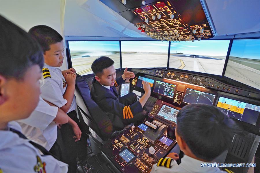 YUNNAN, 17 julio, 2019 (Xinhua) -- Estudiantes aprenden de un instructor (2-d) en un simulador de vuelo de un avión C919 de la Corporación de Aviones Comerciales de China (COMAC, por sus siglas en inglés) durante un campamento de verano de temática de aviación para estudiantes de primaria y secundaria, en Kunming, provincia de Yunnan, en el suroeste de China, el 17 de julio de 2019. (Xinhua/Qin Qing)
