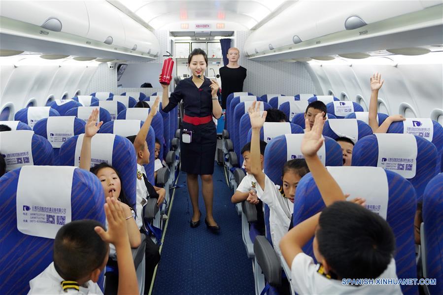 YUNNAN, 17 julio, 2019 (Xinhua) -- Estudiantes asisten a una lección sobre emergencias de incendios en cabinas durante un campamento de verano de temática de aviación para estudiantes de primaria y secundaria, en Kunming, provincia de Yunnan, en el suroeste de China, el 17 de julio de 2019. (Xinhua/Qin Qing)