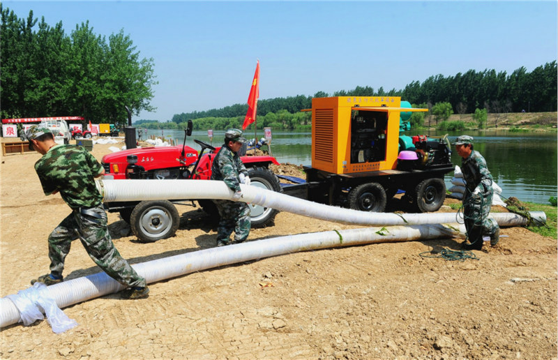 Miembros de un equipo de prevención de inundaciones en Fuyang implementan equipos. [WANG BIAO / PARA CHINA DAILY]