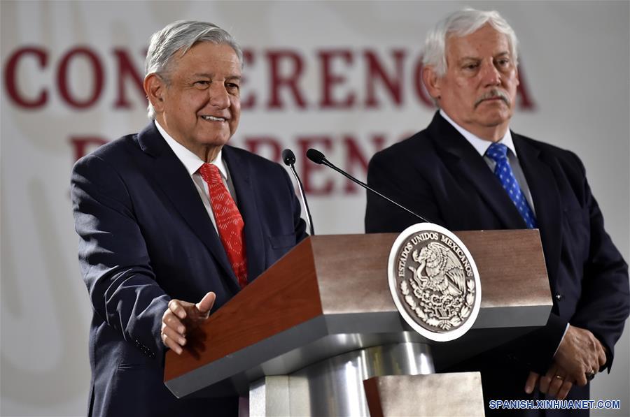 El presidente de México, Andrés Manuel López Obrador (i), participa en una rueda de prensa en Palacio Nacional, en la Ciudad de México, capital de México, el 17 de julio de 2019. López Obrador, anunció el miércoles que en los próximos días se reunirá en el país con legisladores estadounidenses para acelerar la aprobación del Tratado entre México, Estados Unidos y Canadá (T-MEC) de libre comercio. (Xinhua/Str)