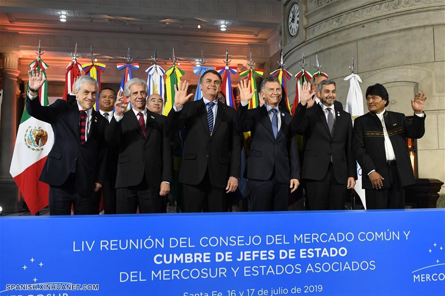 (De izq. a der., frente) Imagen proveída por la Agencia de Noticias Télam de los presidentes, de Chile Sebastián Pi?era, de Uruguay Tabaré Vázquez, de Brasil Jair Bolsonaro, de Argentina Mauricio Macri, de Paraguay Mario Abdo Benítez, y de Bolivia Evo Morales, posando durante la 54 Cumbre de Jefes de Estado del Mercado Común del Sur (Mercosur), en Santa Fe, Argentina, el 17 de julio de 2019. La Cumbre de Jefes de Estado del Mercosur se lleva a cabo en la ciudad argentina de Santa Fe, a 395 kilómetros al noroeste de Buenos Aires, con la asistencia de los presidentes de Brasil, Jair Bolsonaro, de Paraguay, Mario Abdo Benítez, y de Uruguay, Tabaré Vázquez, además del anfitrión Macri. (Xinhua/Luis Cetraro/TELAM)