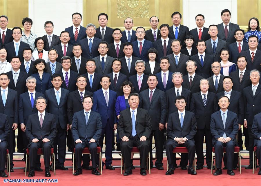 El presidente chino, Xi Jinping (c-primera fila), también secretario general del Comité Central del Partido Comunista de China (PCCh) y presidente de la Comisión Militar Central, se reúne con enviados diplomáticos chinos ante otros países, quienes se encuentran en Beijing para asistir a una conferencia de trabajo para enviados en el exterior, en el Gran Palacio del Pueblo en Beijing, capital de China, el 17 de julio de 2019. Wang Huning, miembro del Comité Permanente del Buró Político del Comité Central del PCCh y miembro del Secretariado del Comité Central del PCCh, también estuvo presente. (Xinhua/Zhang Ling)