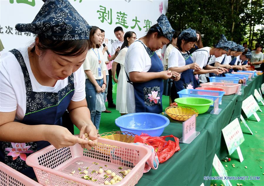 FUJIAN, 21 julio, 2019 (Xinhua) -- Agricultoras pelan semillas de loto durante un festival del loto en la municipalidad de Wufu de la ciudad de Wuyishan, en la provincia de Fujian, en el sureste de China, el 21 de julio de 2019. La localidad de Wufu lleva a cabo el festival anual del loto para mejorar las industrias rurales relacionadas con el loto. (Xinhua/Zhang Guojun)