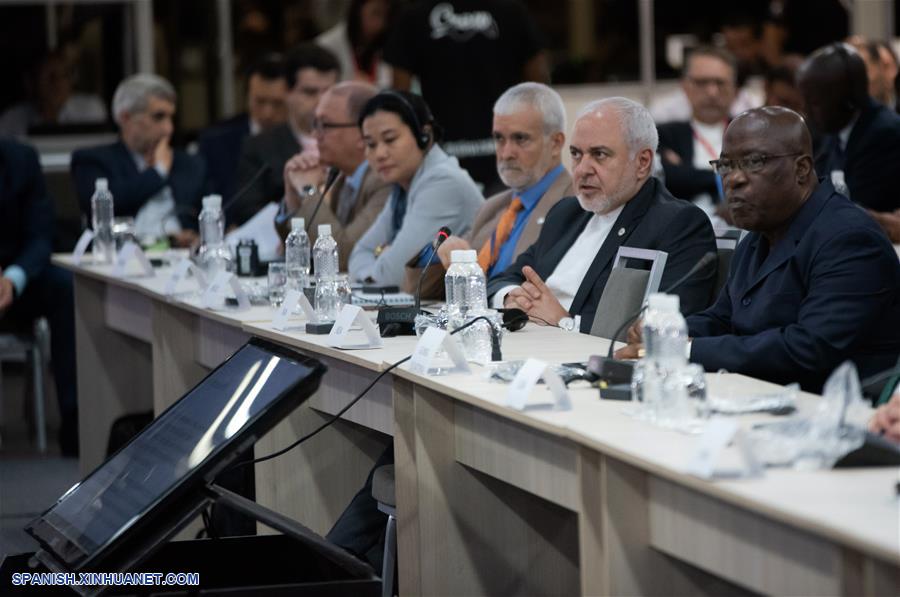 El ministro de Relaciones Exteriores de Irán, Mohamad Javad Zarif (2-d), habla durante una reunión del Grupo de Países Amigos en defensa de la Carta de Naciones Unidas, en Caracas, Venezuela, el 21 de julio de 2019. El Grupo de Países Amigos en defensa de la Carta de Naciones Unidas acordó el domingo en Caracas una declaración a favor del diálogo en Venezuela y contra las medidas coercitivas. (Xinhua/Marcos Salgado)
