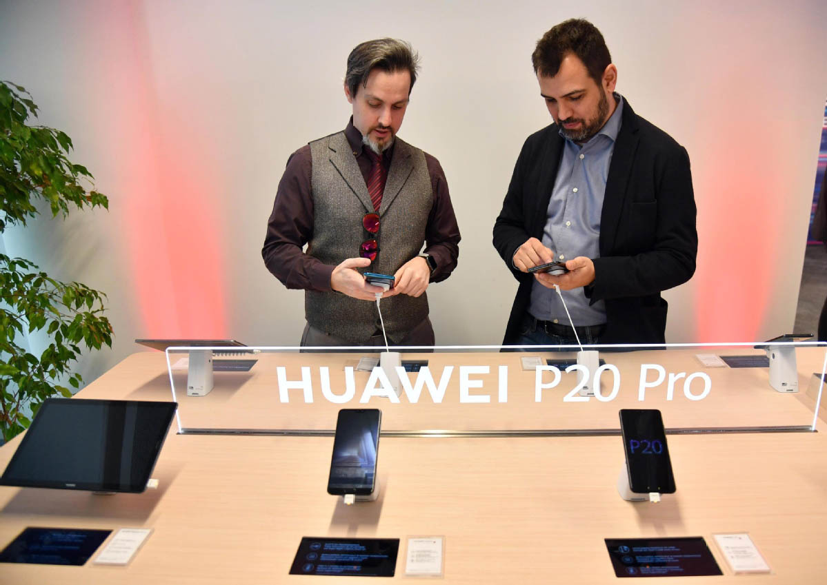 Los productos de Huawei en exhibición durante la apertura de las nuevas oficinas de la compa?ía en Milán, en el norte de Italia, a principios de este a?o. [China Daily]