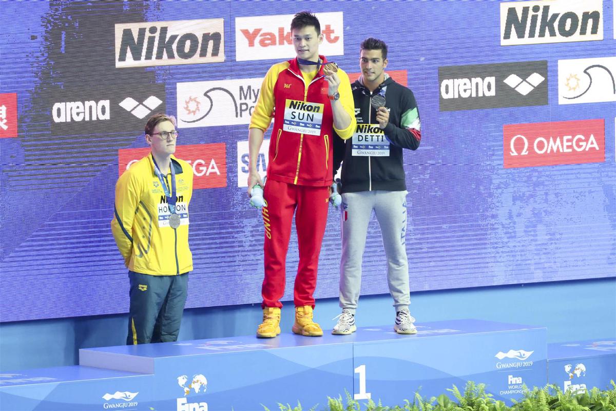 Sun lideró hasta ganar con un crono de 3:42.44 u décima medalla de oro individual en el Campeonato Mundial FINA. El australiano Mack Horton logró la plata con 3:43.17 y Gabrile Detti el bronce con 3:43.23.