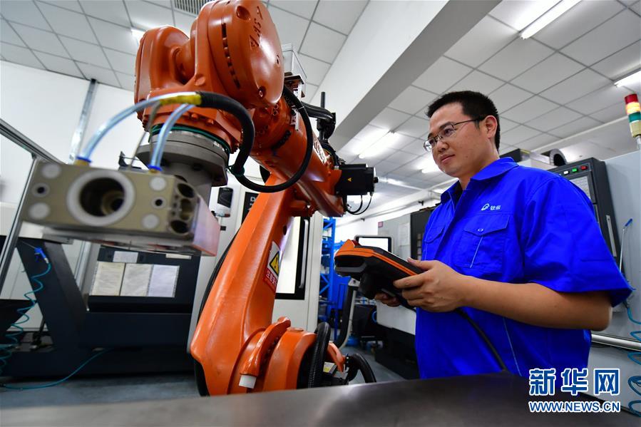 Un trabajador opera un robot en una compa?ía que produce productos mecánicos eléctricos en Langfang, provincia de Hebei. (Foto / Xinhua)