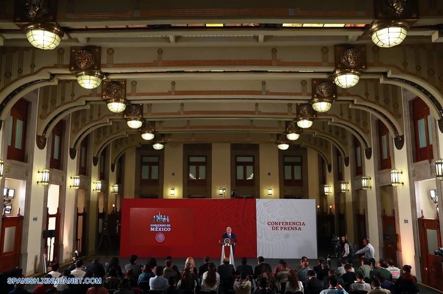 El presidente de México, Andrés Manuel López Obrador, habla en una rueda de prensa en Palacio Nacional, en la Ciudad de México, capital de México, el 23 de julio de 2019. López Obrador, dijo el martes que el país no renunciará a organismos como el Fondo Monetario Internacional (FMI) pese a las discrepancias sobre la forma de medir el crecimiento económico. (Xinhua/Str)