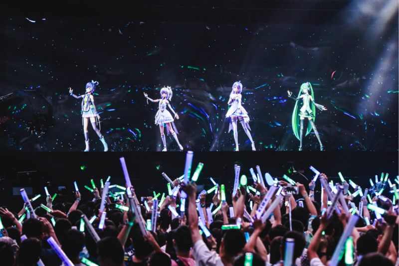 La cantante virtual china Luo Tianyi, las mascotas Bilibili 33 y 22, y la ídolo virtual japonesa Hatsune Miku (de izquierda a derecha) saludan a los aficionados en el escenario de un concierto holográfico BML en Shanghai, el 19 de julio de 2019. [Foto proporcionada a chinadaily.com. cn]