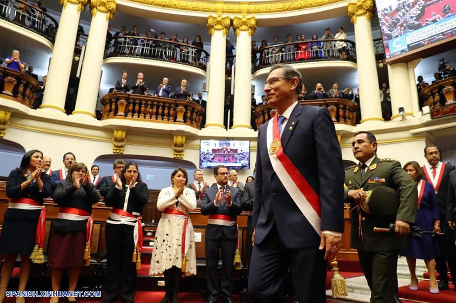 Imagen cedida por la Agencia Peruana de Noticias Andina, del presidente peruano, Martín Vizcarra (c), reaccionando a su llegada para ofrecer el Mensaje a la Nación por Fiestas Patrias, ante el Congreso Nacional, en Lima, Perú, el 28 de julio de 2019. Vizcarra, propuso el domingo adelantar para el a?o próximo las elecciones generales que se iban a celebrar en 2021. (Xinhua/Prensa Presidencial/ANDINA)